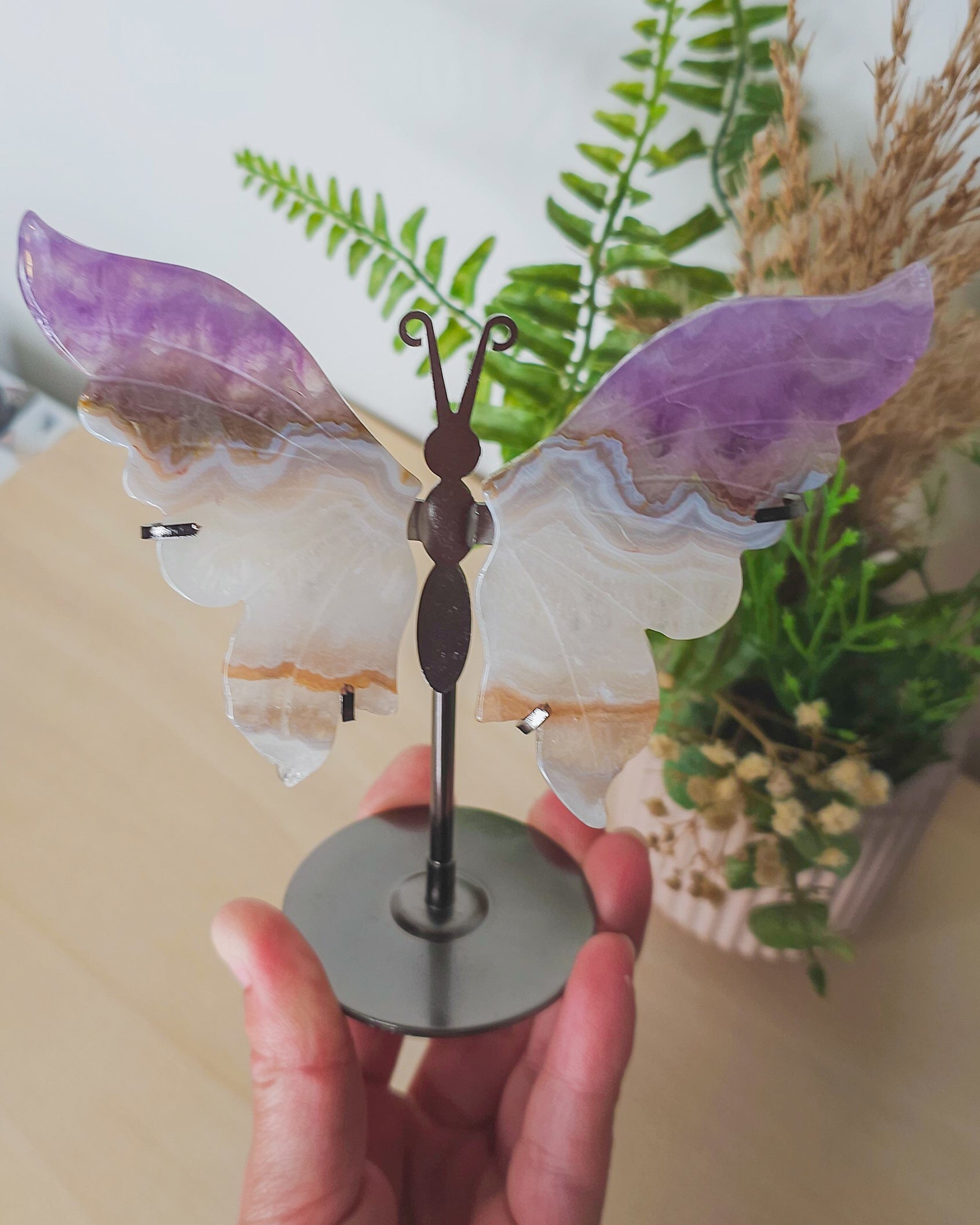 Amethyst, Agate & Clear Quartz Butterfly Wings on Stand – Harmonious Awakening