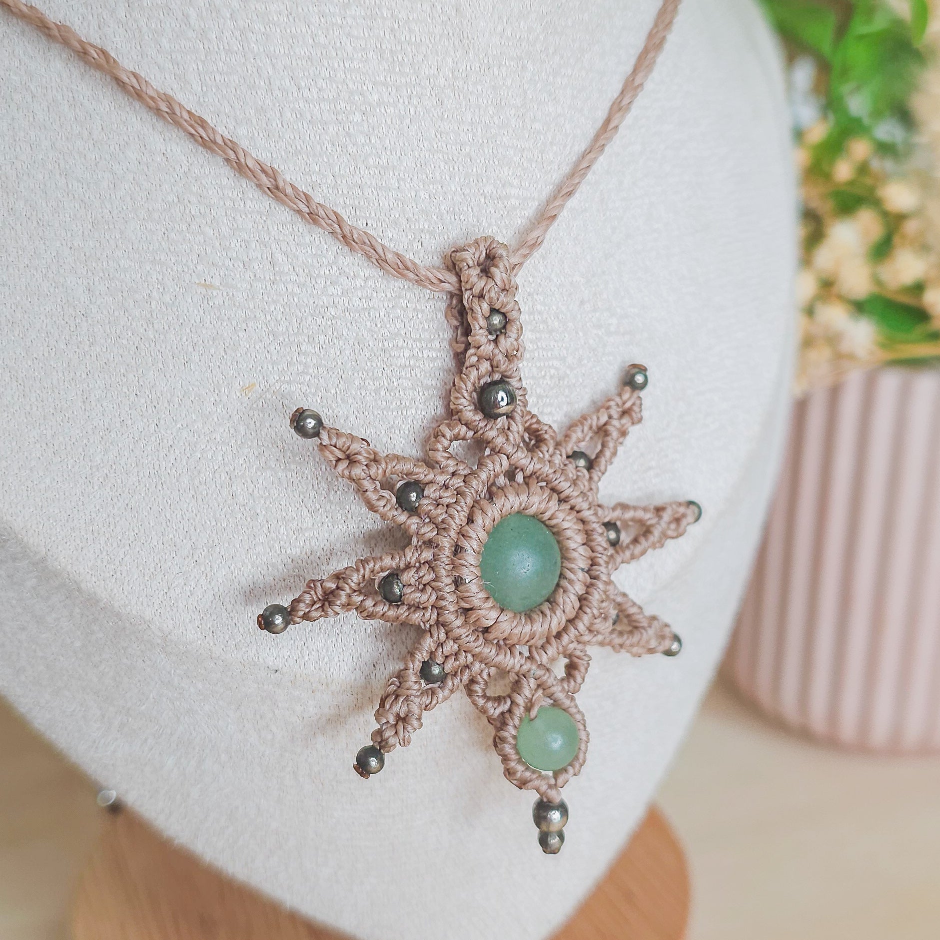 This necklace is named Bright Path, a reflection of the hopeful energy that emerges when we say yes to new beginnings. Its radiant, sun-like shape speaks of possibility rising over the horizon—warm, steady, and full of life. Woven with the micromacrame technique and centered with luminous Green Aventurine beads, it’s designed to gently support you on your journey forward.