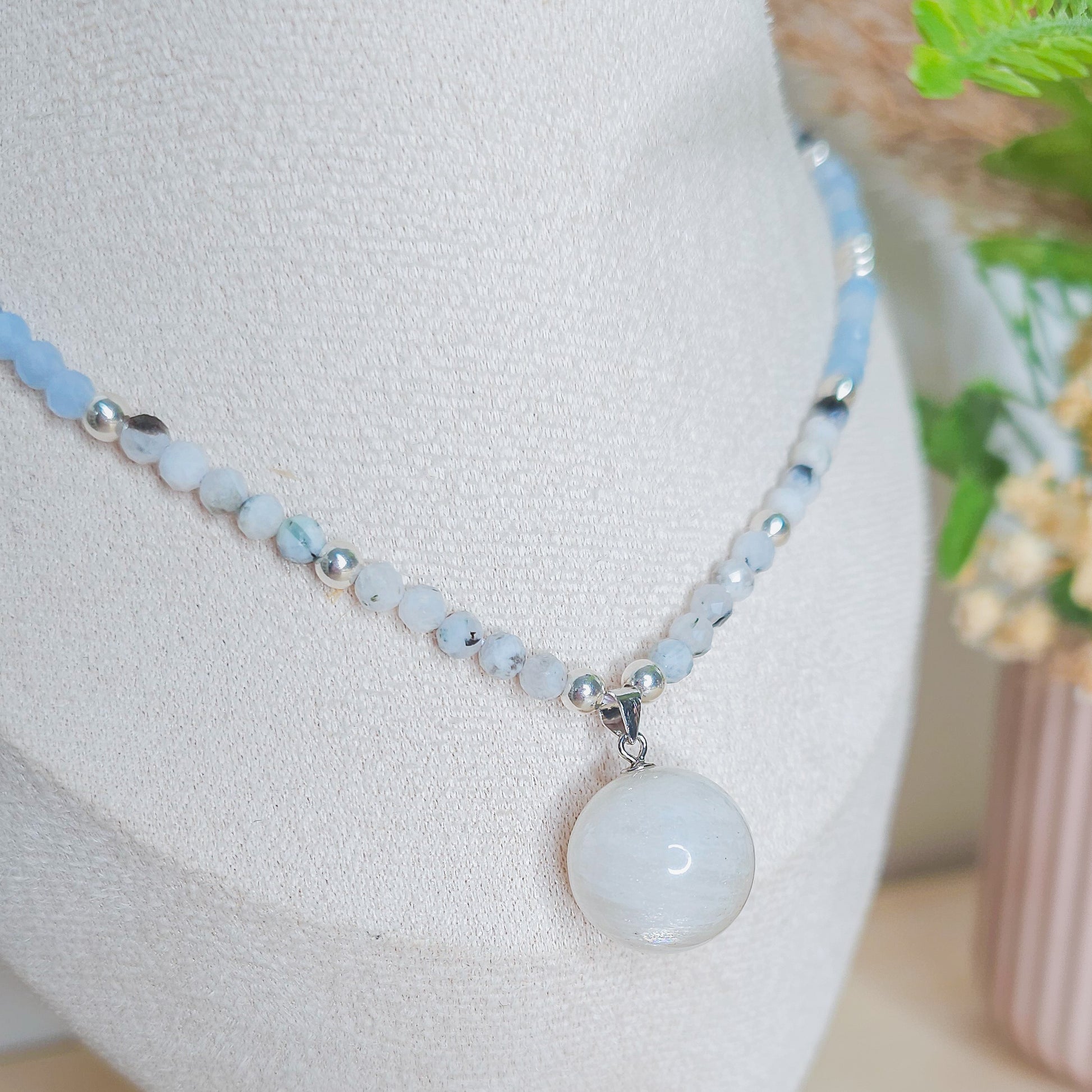 Celestial Flow | Handmade Necklace with Moonstone Sphere Pendant, Moonstone, Aquamarine and 925 Silver Beads