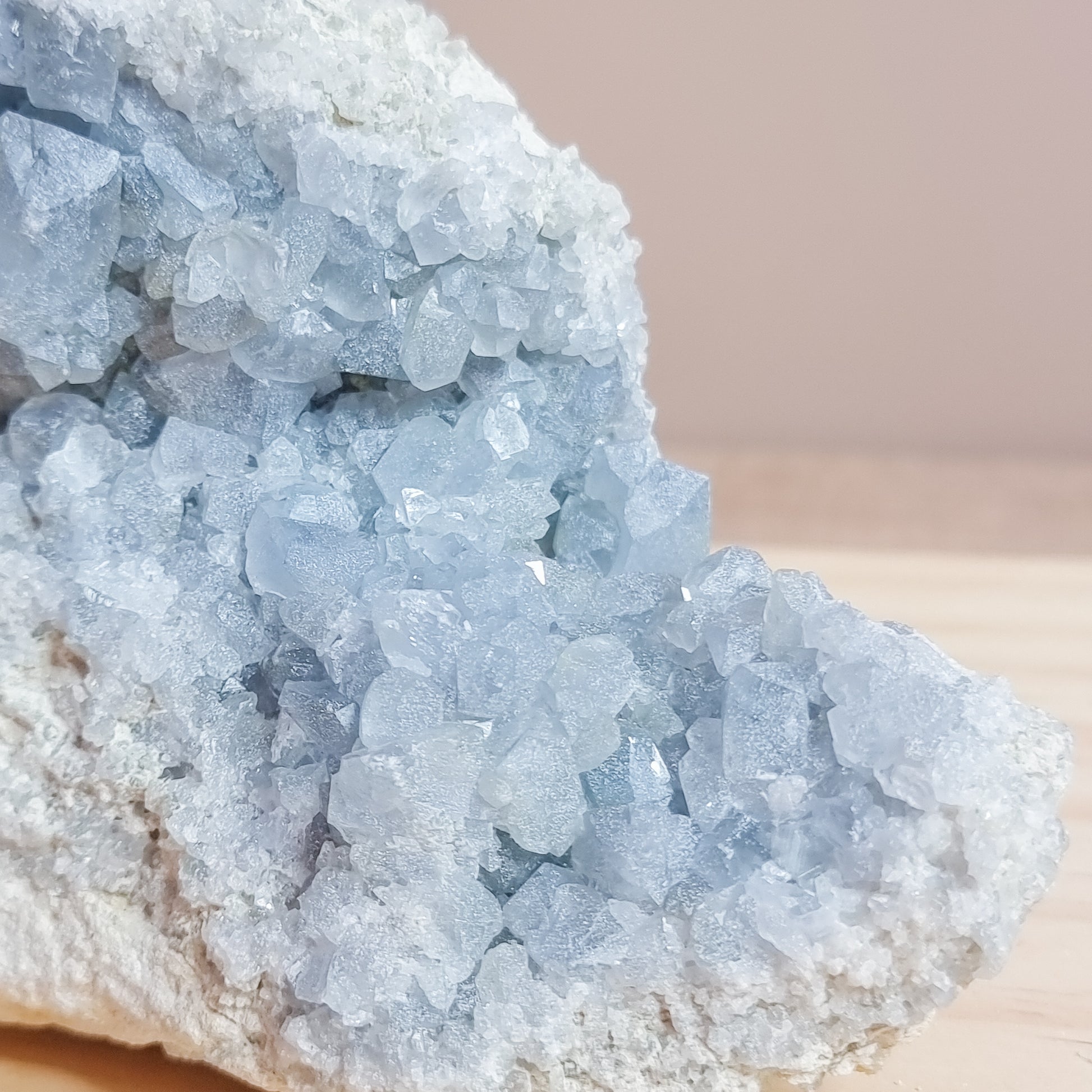 Celestite has a high vibration and is a teacher for the New Age. It is imbued with divine energies. It takes you into the infinite peace of the spiritual and contacts the angelic realms. It jump-starts spiritual development and urges you toward enlightenment. It is a useful stone for stimulating clairvoyant communication, dream recall and journeys out of the body. This beautiful crystal promotes purity of the heart and attracts good fortune. It heals the aura* and reveals truth, is a stone that brings balance and alignment. The deep peace it holds assists in conflict resolution and in maintaining a harmonious atmosphere in times of stress. Celestite can improve dysfunctional relationships by opening a space for peaceful negotiation. Celestite is a creative stone, especially useful for the arts.