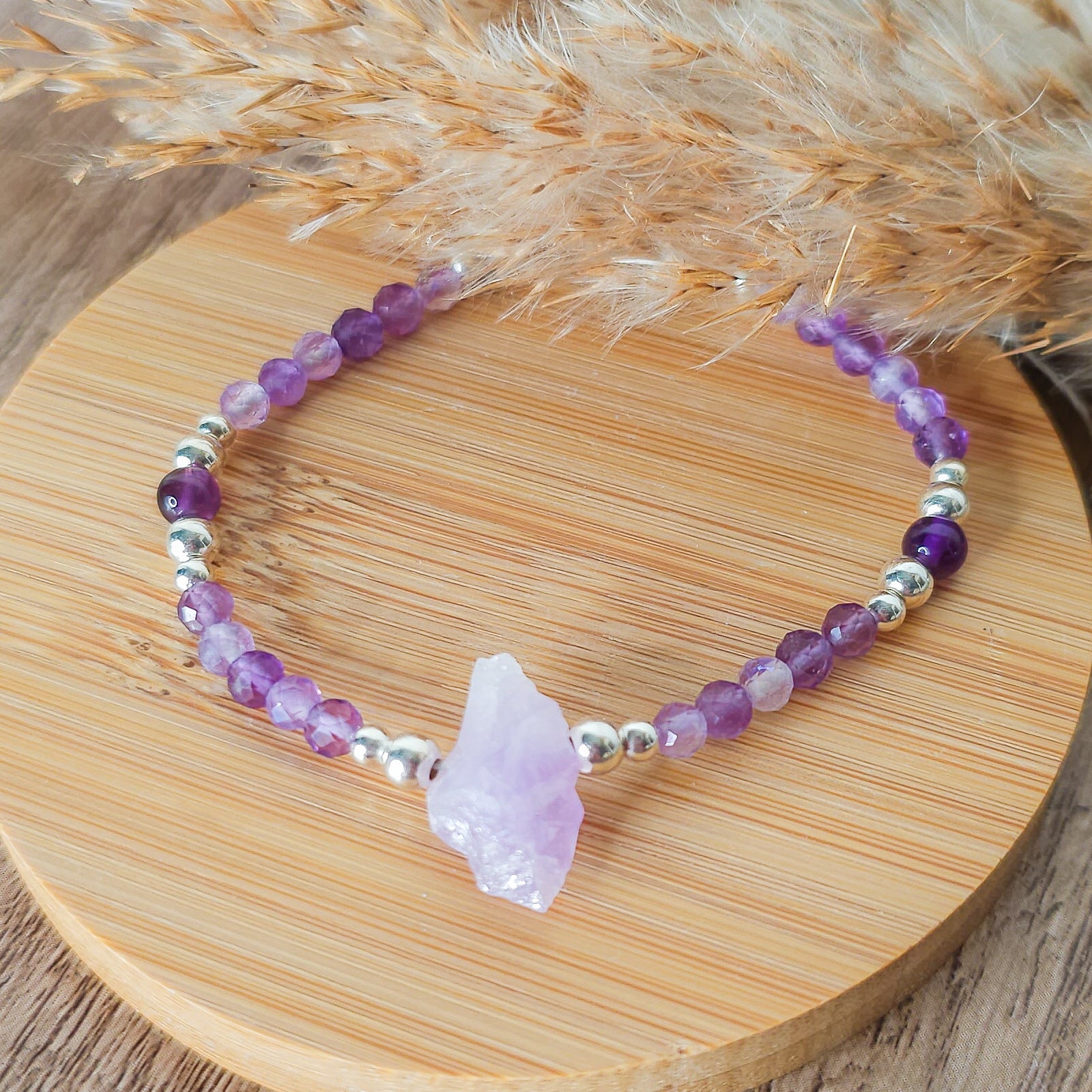 Handmade Bracelet with Raw Amethyst Point, Aura Amethyst and 925 Silver Beads