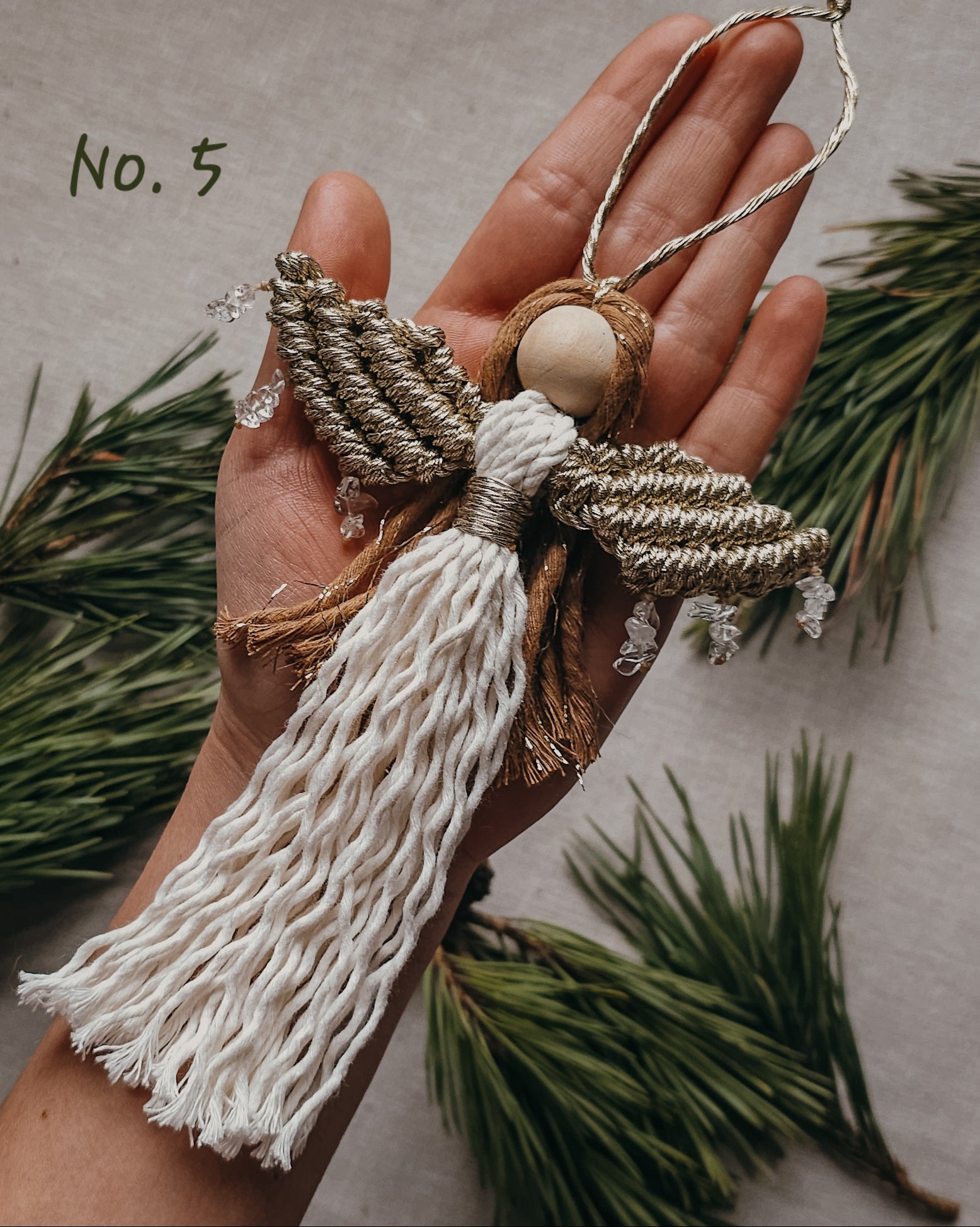 Each of these macramé Christmas tree decorations is handcrafted by myself with care and intention, featuring a genuine Clear Quartz crystal, cotton cord and finished with gold accents.