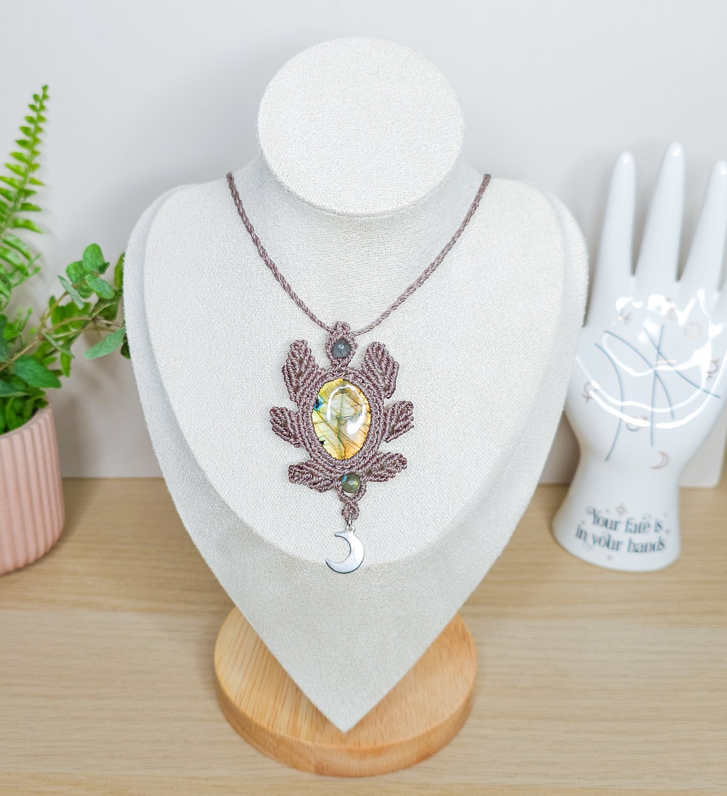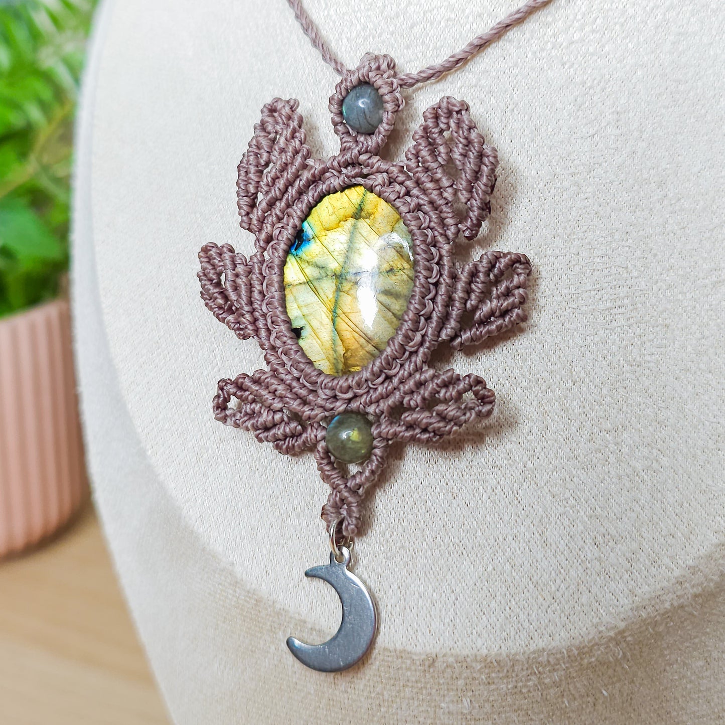 Handmade with Micromacrame Technique Amulet Necklace with Magical Labradorite with stunning very strong flash.