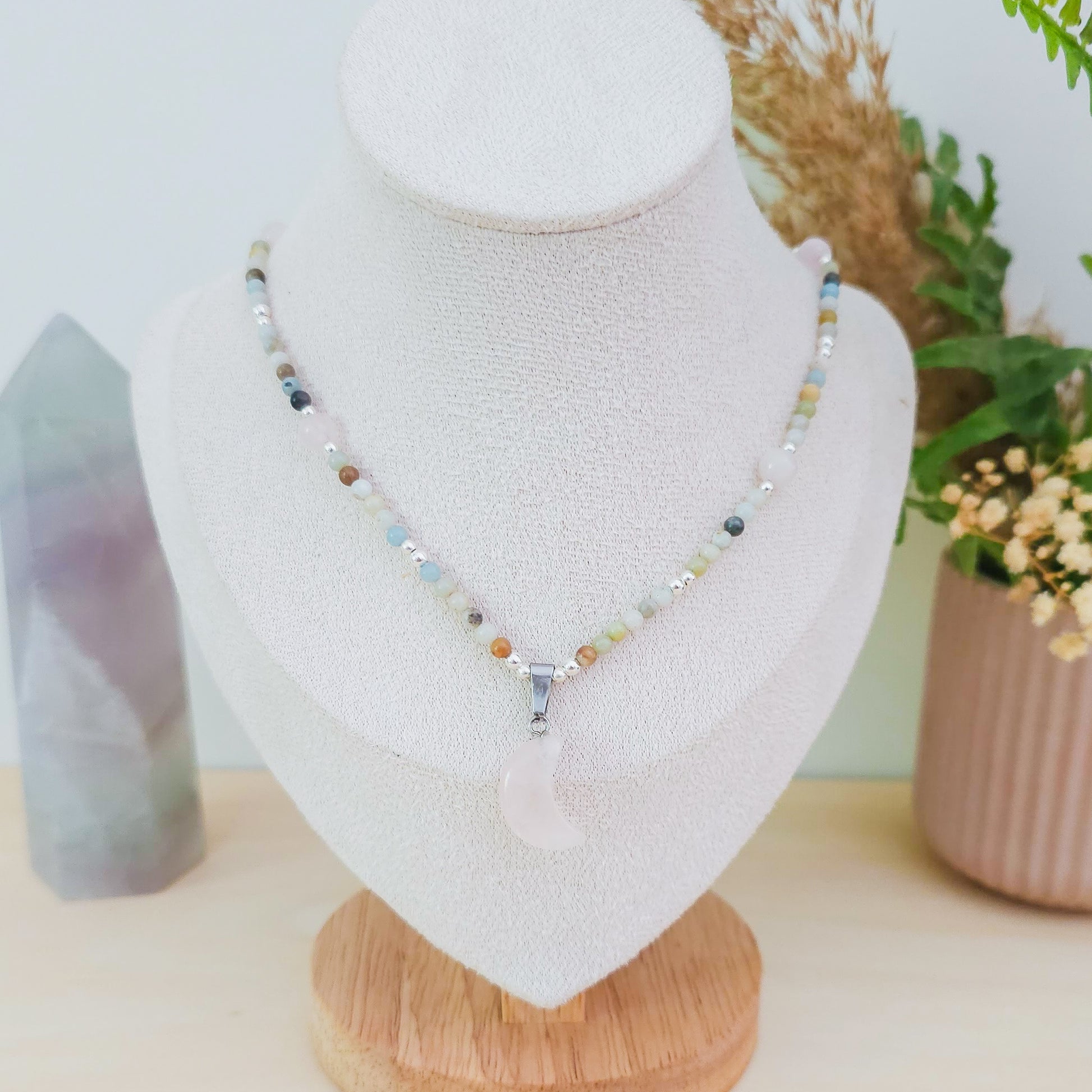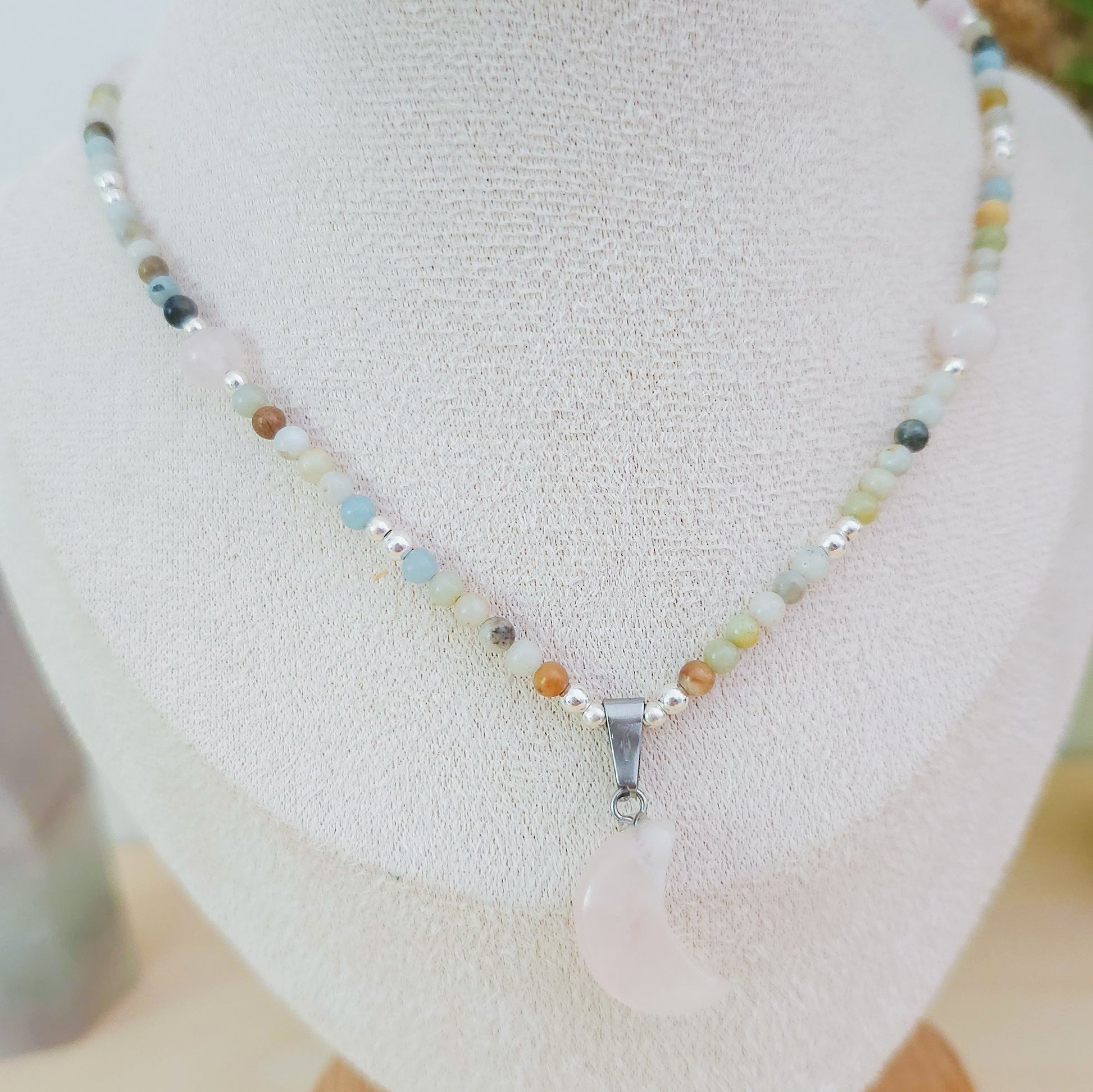 I created this necklace with the intention of offering soothing comfort, emotional balance, and heart-centered clarity. Each stone—Rose Quartz and Amazonite—was carefully chosen for its unique energy and meaning.