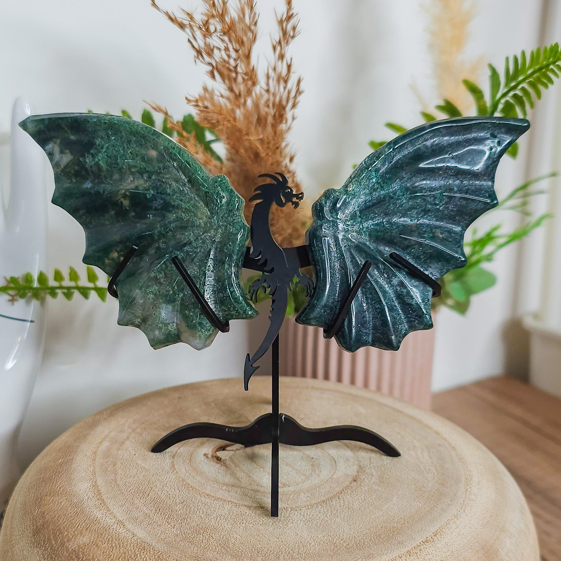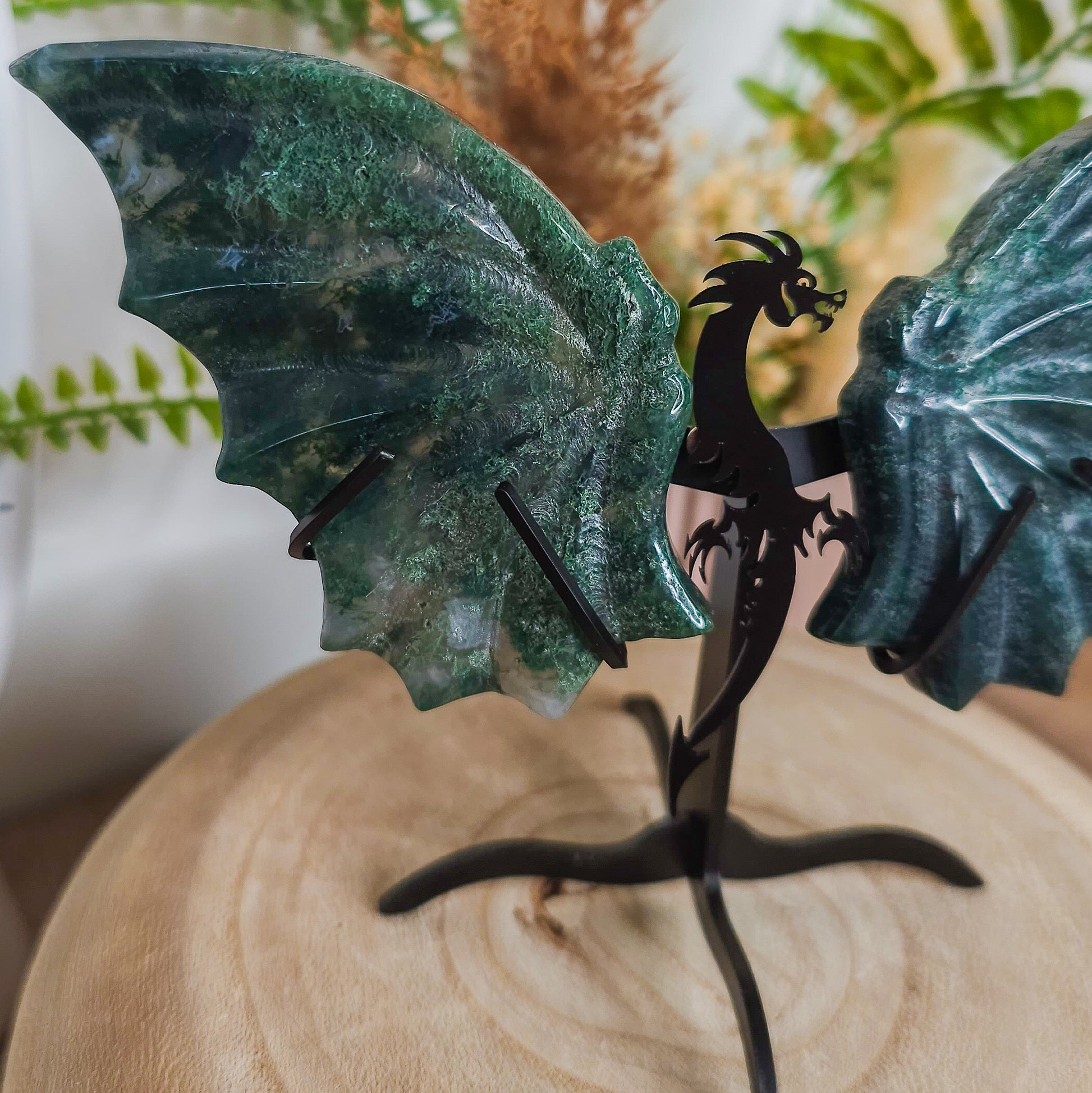 Moss Agate Dragon Wings on the stand