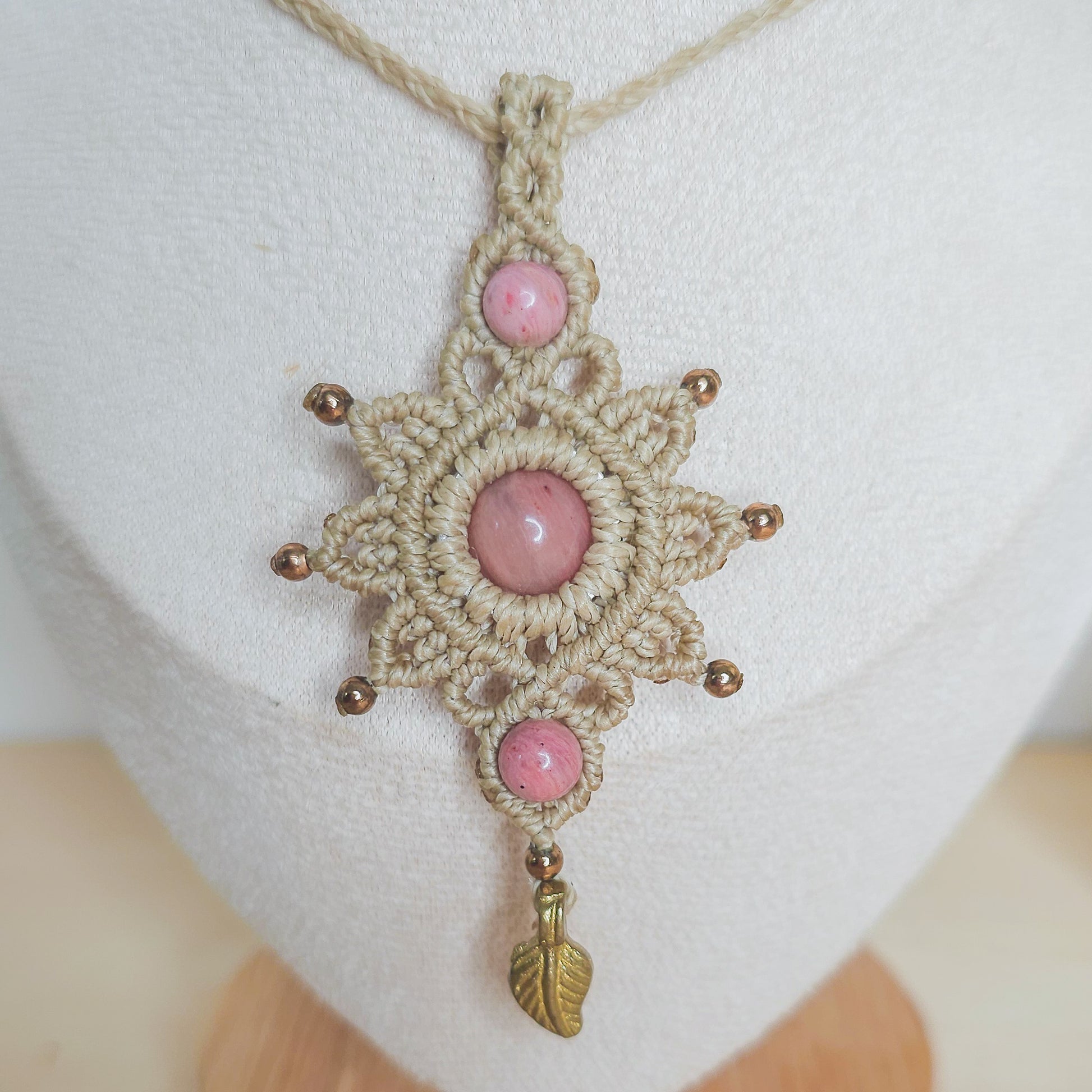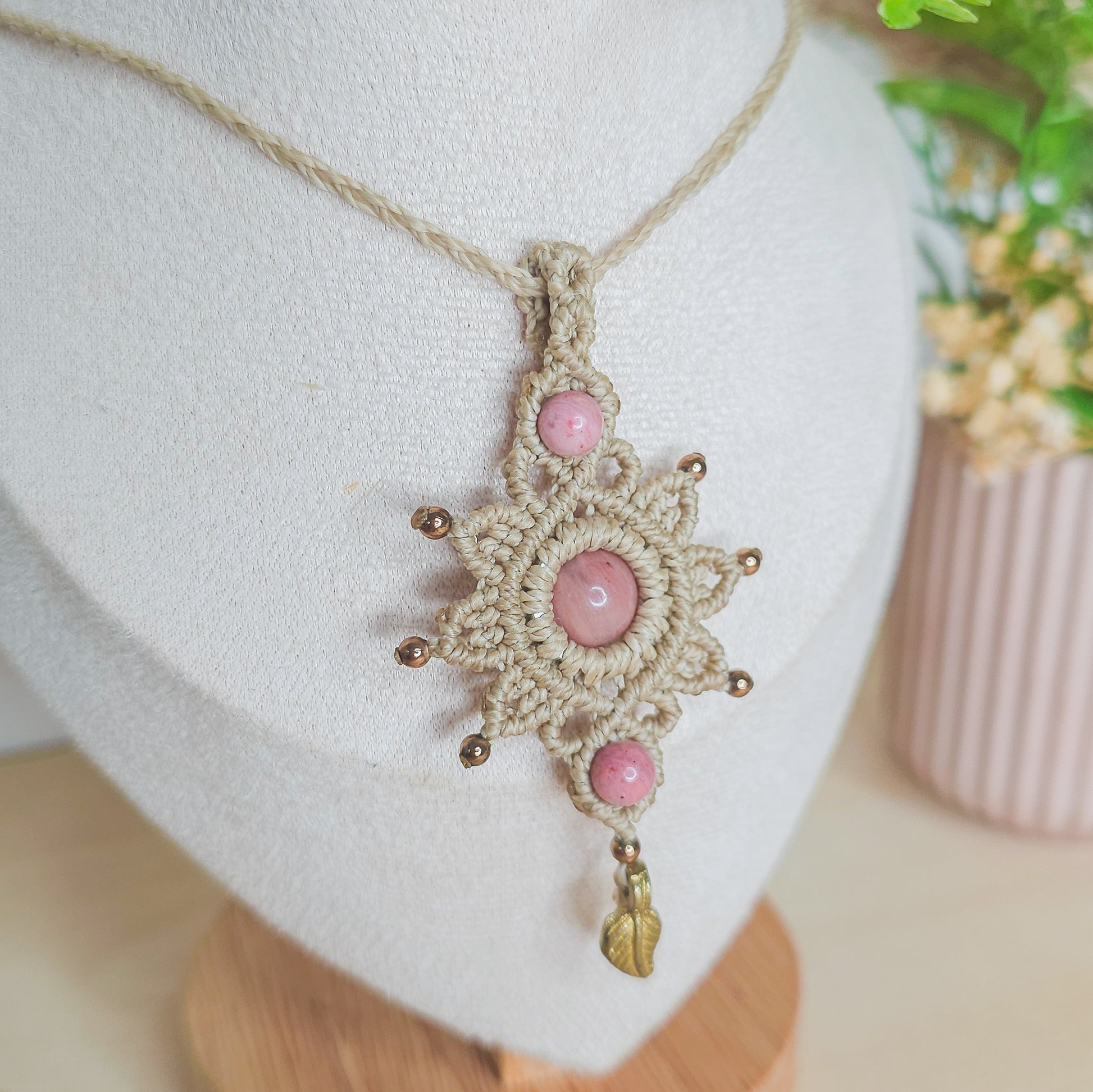 I called this necklace Radiant Heart, inspired by the warmth of the sun and the strength of an open heart. Its design gently echoes the shape of sun, symbolizing hope, rebirth, and the light we carry within—even after darkness. Hand-knotted using the micromacrame technique, it features softly coloured Rhodonite beads.