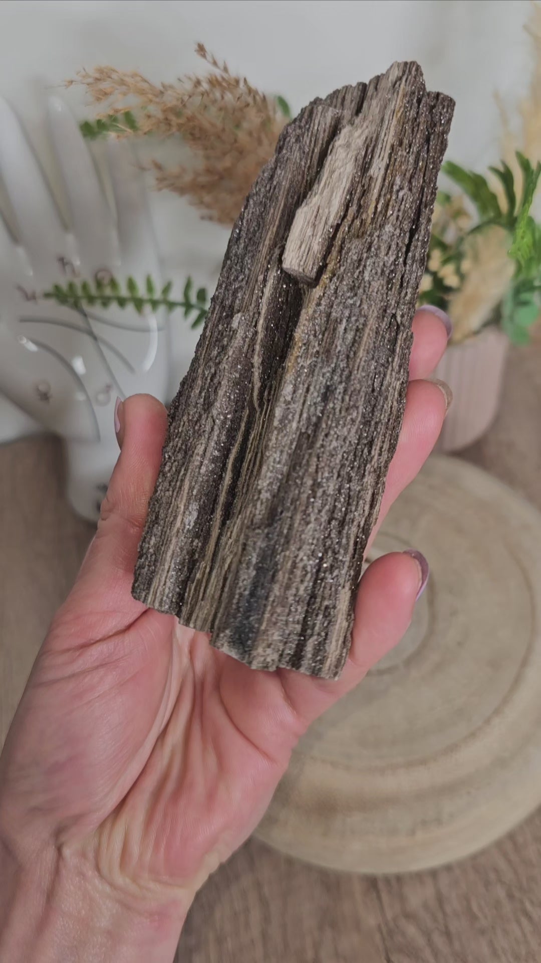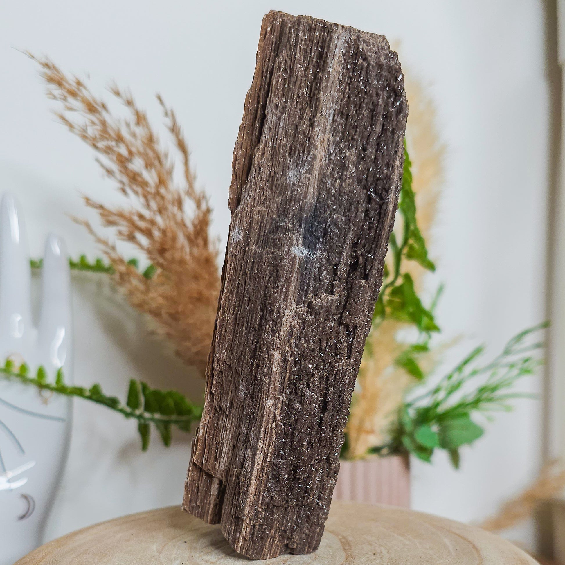 "Protective Petrified Wood is invaluable for grounding high vibrations into the earth. This stone formed when a living tree fell into water and elements such as manganese, iron and copper were alchemically absorbed. In many cases the wood turned to shining silica.