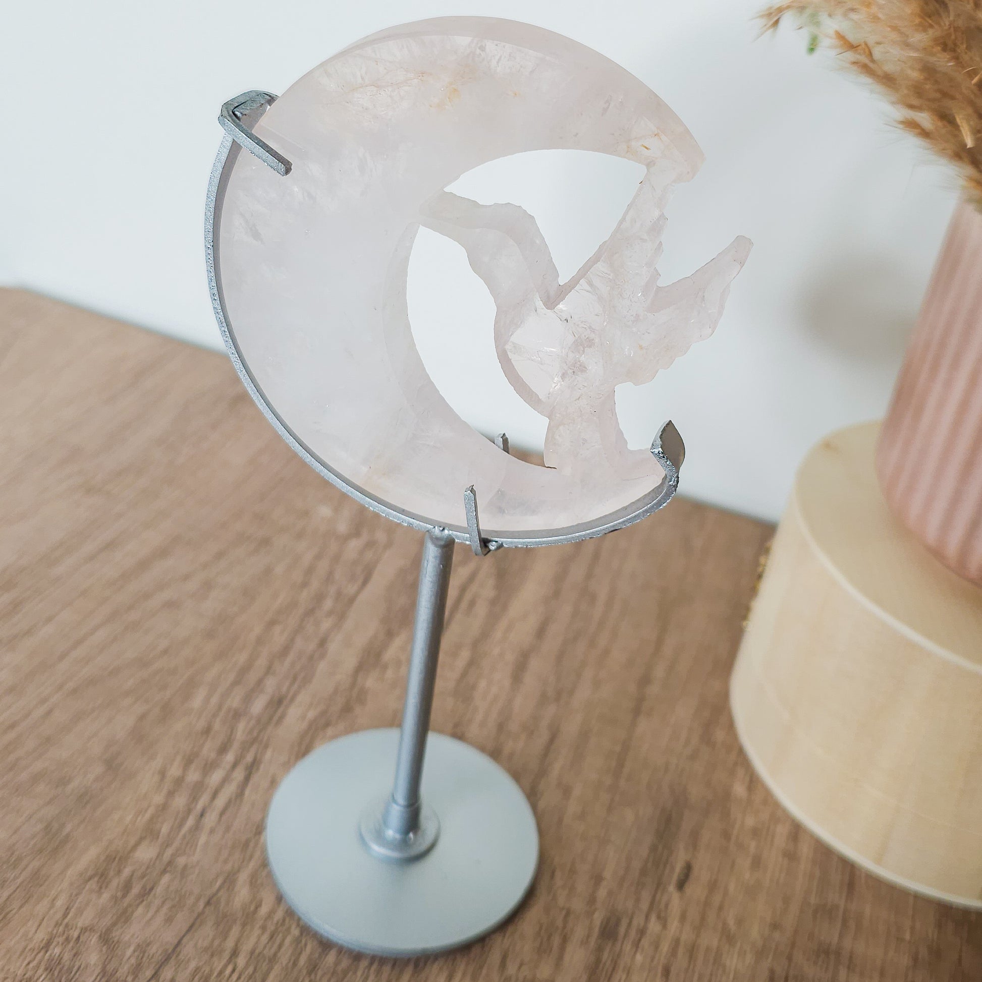 Rose Quartz Moon Carving on the stand.