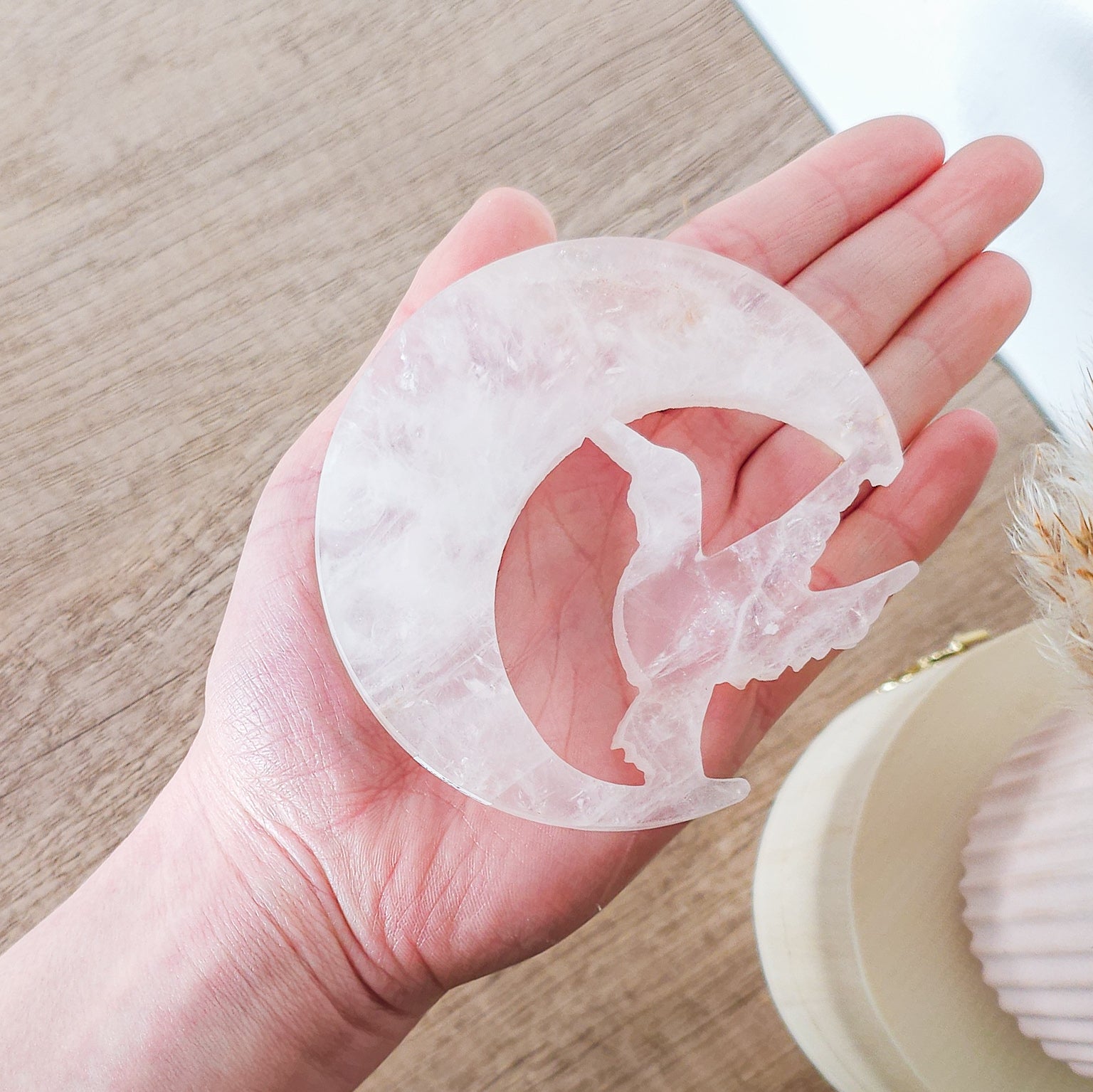 Rose Quartz Hummingbird with the Moon Carving on the stand