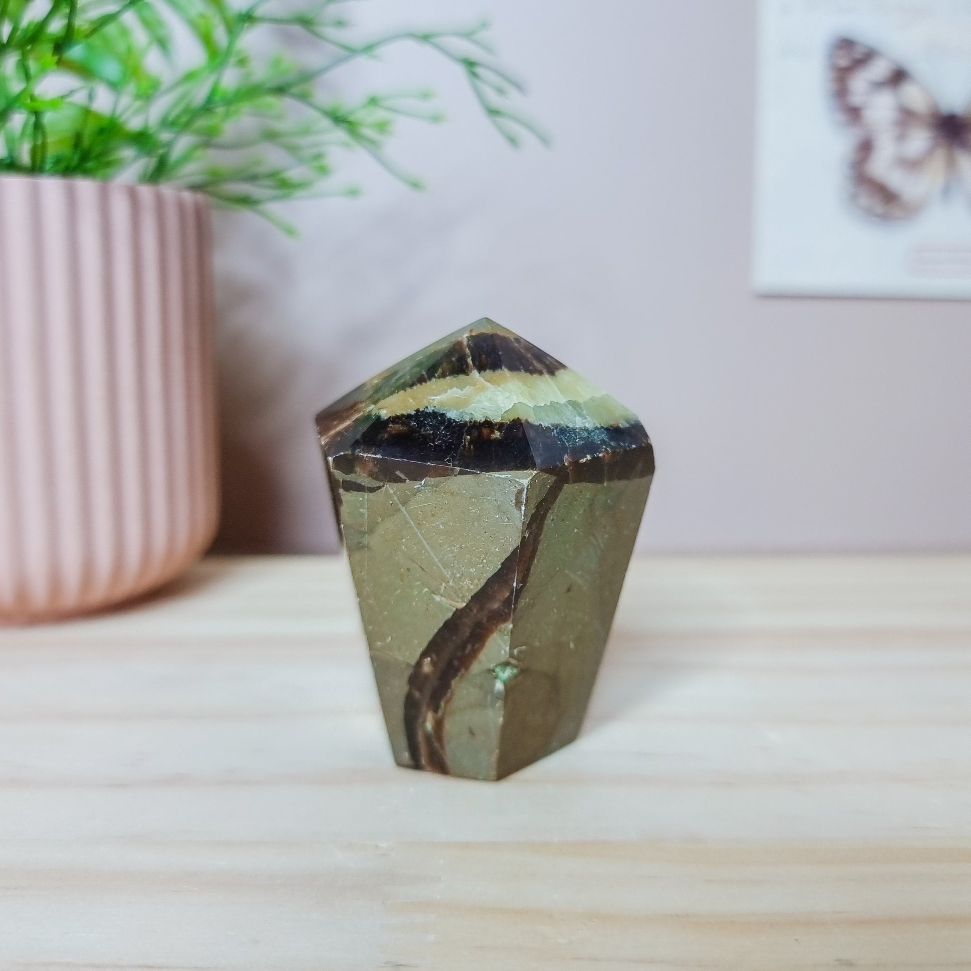 Mentally this joyous stone provides support while you incubate ideas and assists in manifesting them, inculcating patience, tolerance and endurance. Conversely, if you have ideas but never put them into practice, it concretizes your creativity. Septarian is a useful support during public speaking as it assists in making each individual within an audience feel that they are being personally addressed. Septarian also enhances your ability to communicate within a group.