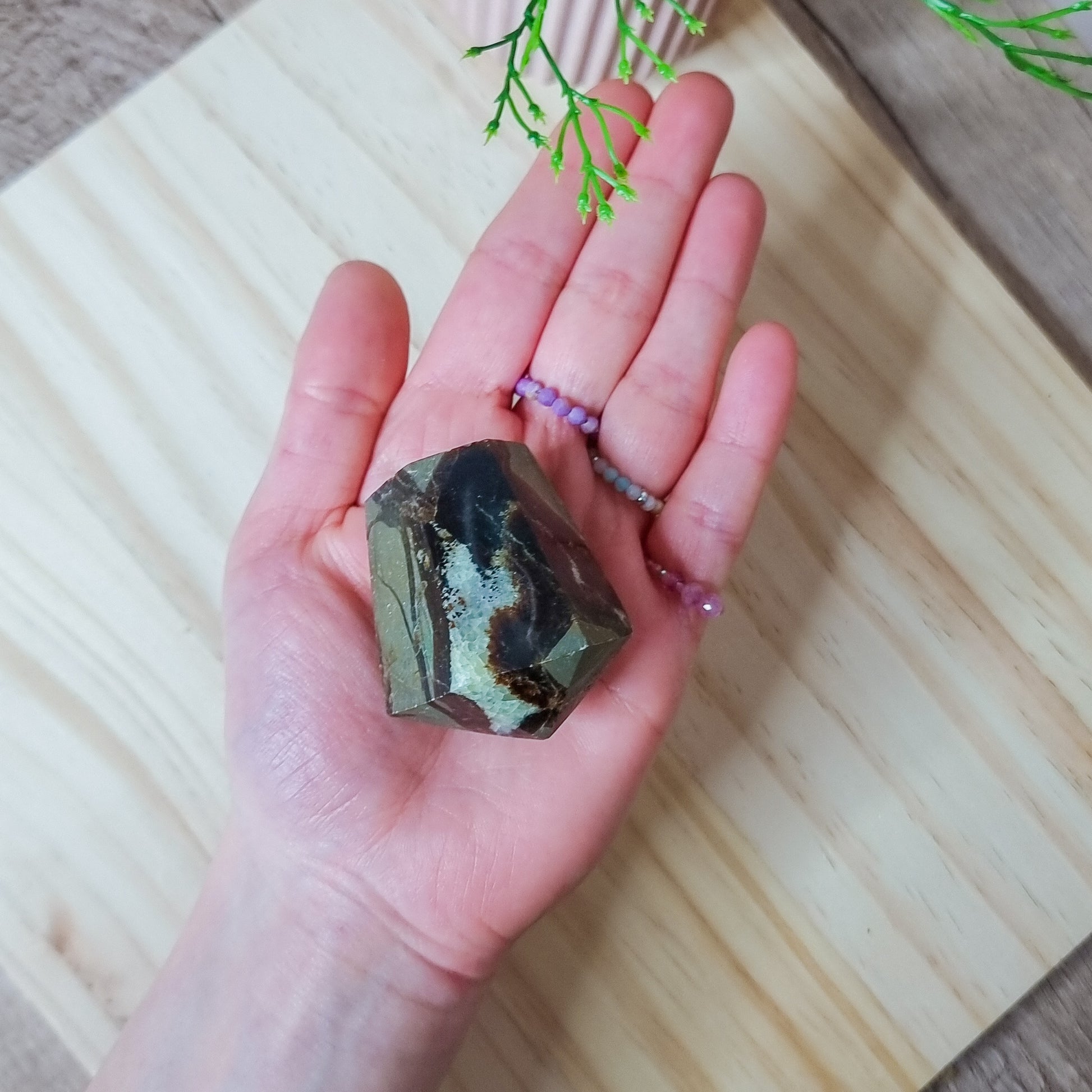 Emotionally nourishing and calming, Septarian is a useful tool for self-nurturing and for caring about others. Healers can meditate with Septarian for insight into the cause of dis-ease". This stone is extremely helpful in focusing the body's healing ability and facilitates flexibility of physical movement."