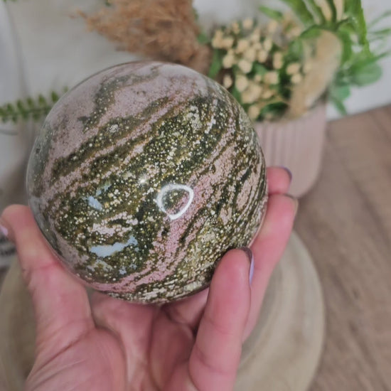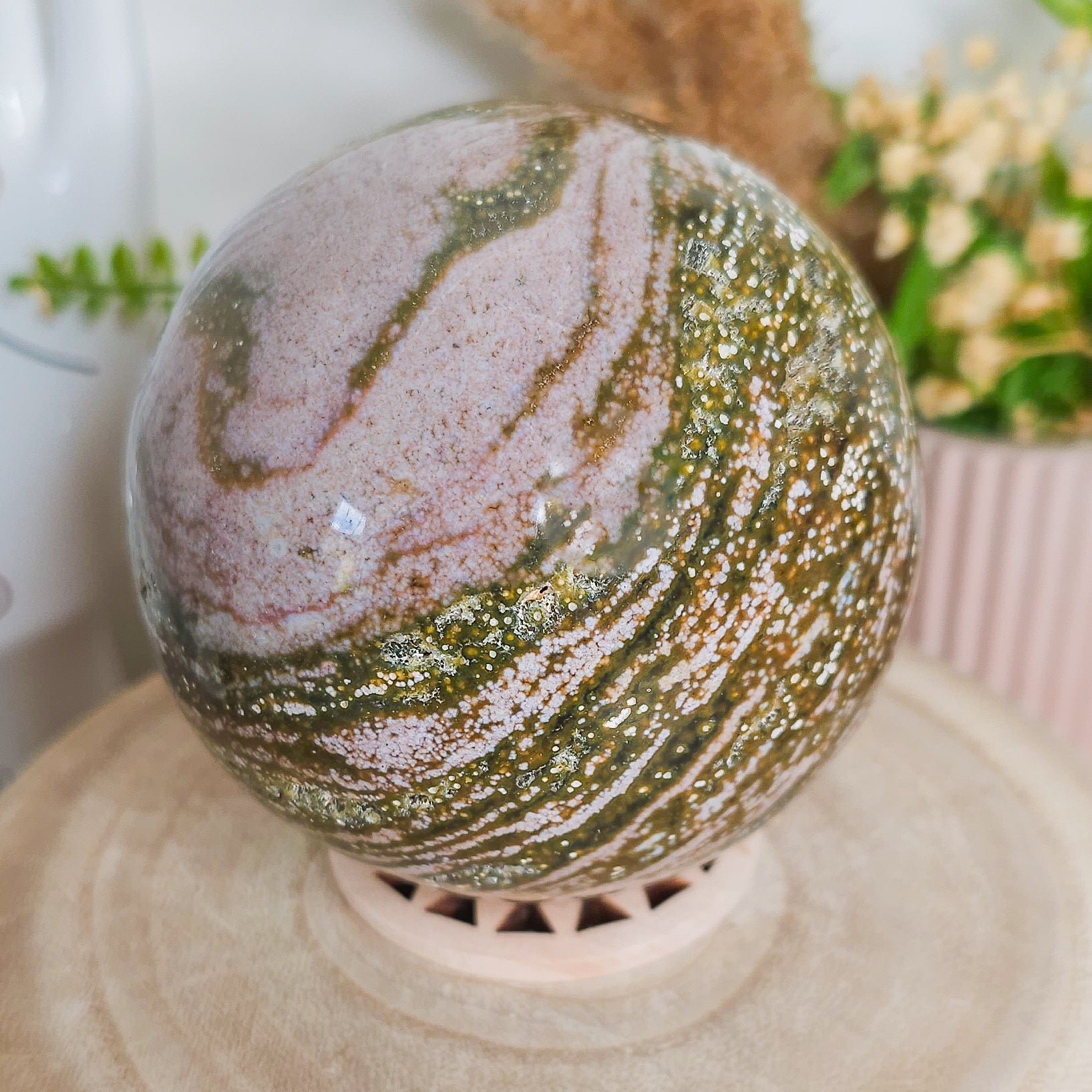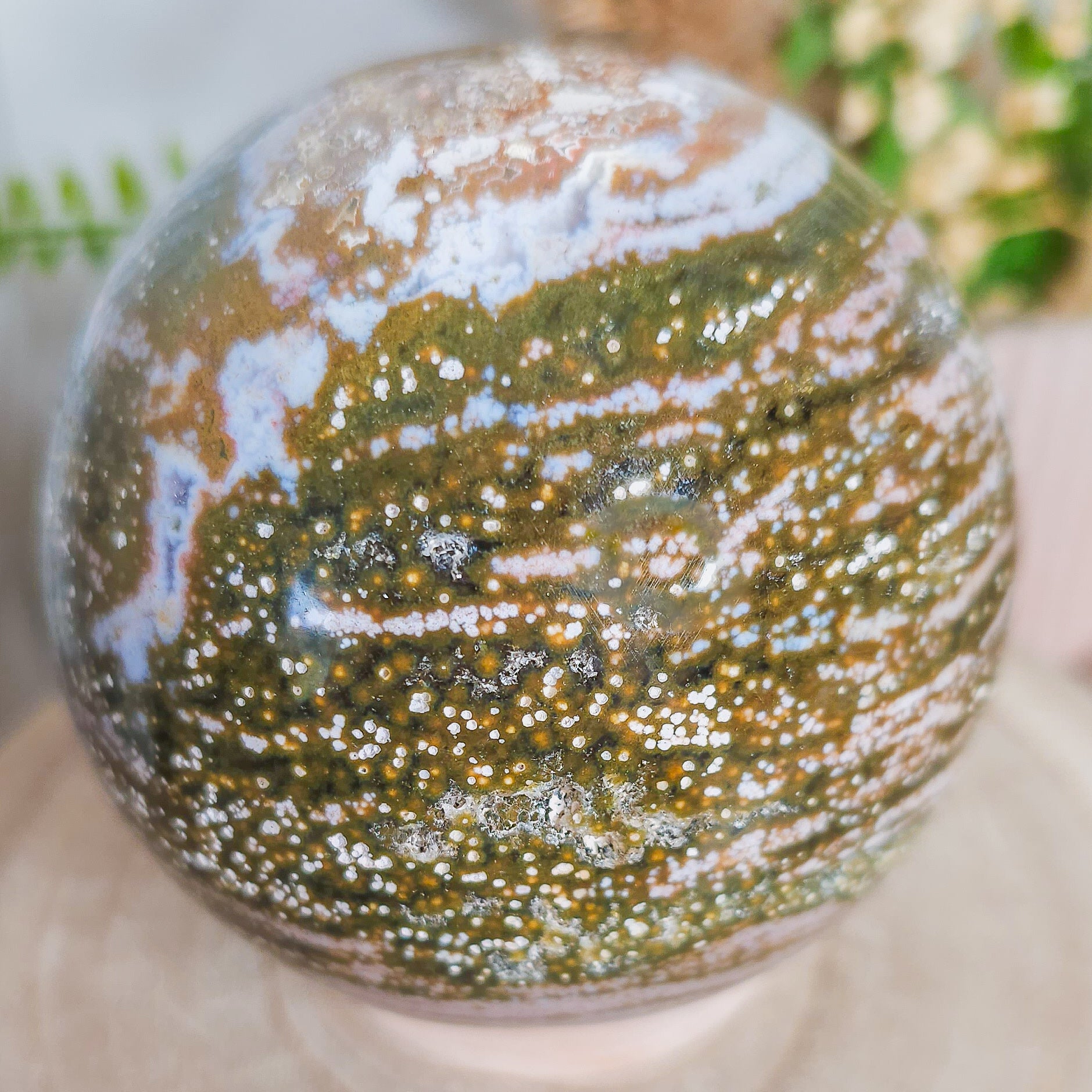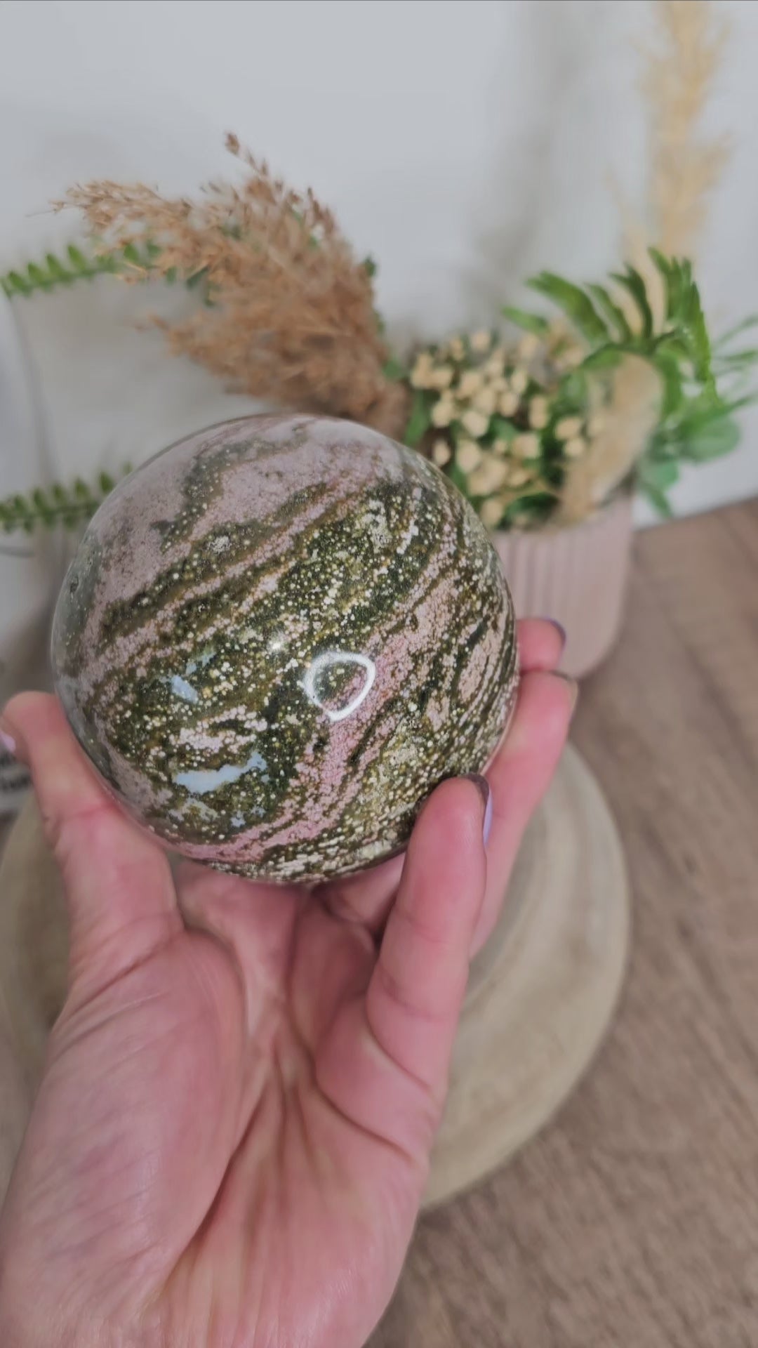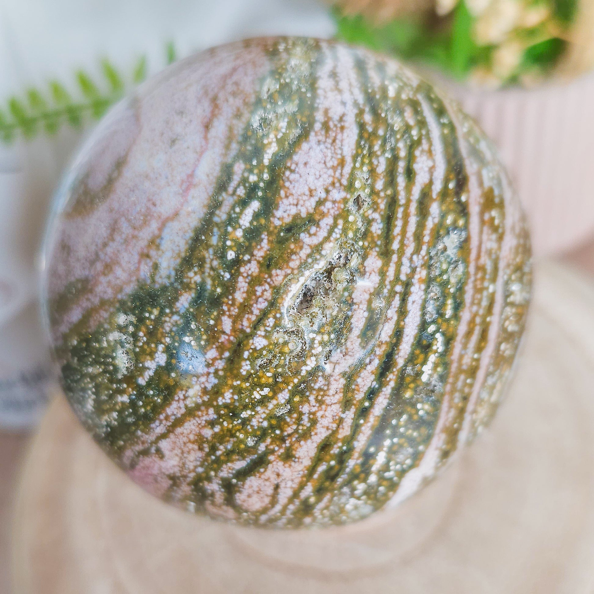 Spiritually, symbolises the interconnectedness of all things- a reminder that nature is cyclical, rhythmical and fluid, Sea Jasper assists in coping with change and in giving service to humanity. Psychologically, the Green Jasper component heals and releases dis-ease" and obsession, balancing parts of life that have become all-important to the detriment of others.