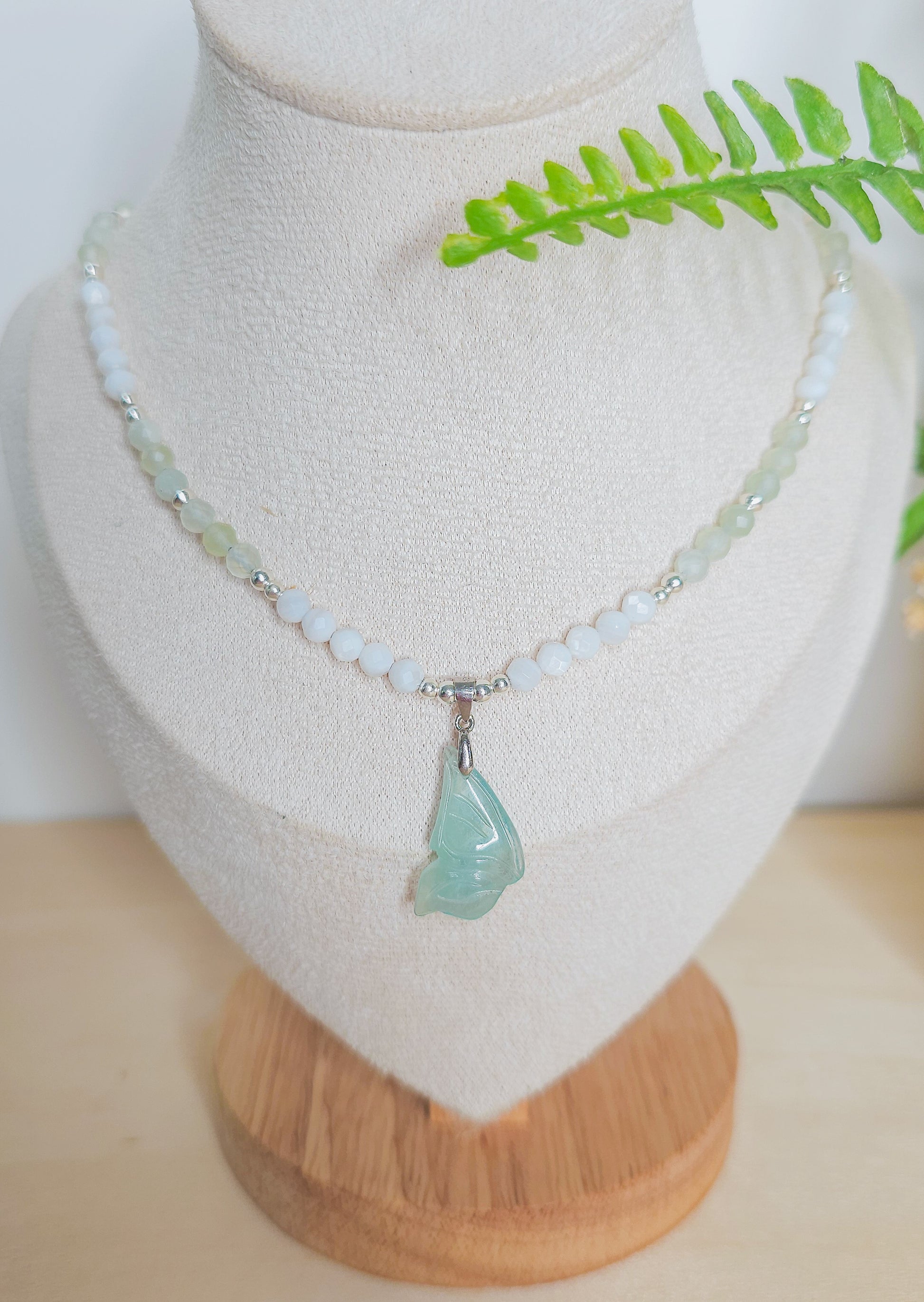 At its centre rests a delicate Aquamarine fairy wing pendant, symbolising the lightness and mystery of realms beyond the veil—realms that reveal themselves when we lead with openness and curiosity. Surrounding it are faceted Prasiolite (green Quartz) beads and luminous white shell with a soft pearlescent glow, coming together to gently guide your energy inward and upward, toward clarity, connection, and quiet magic.